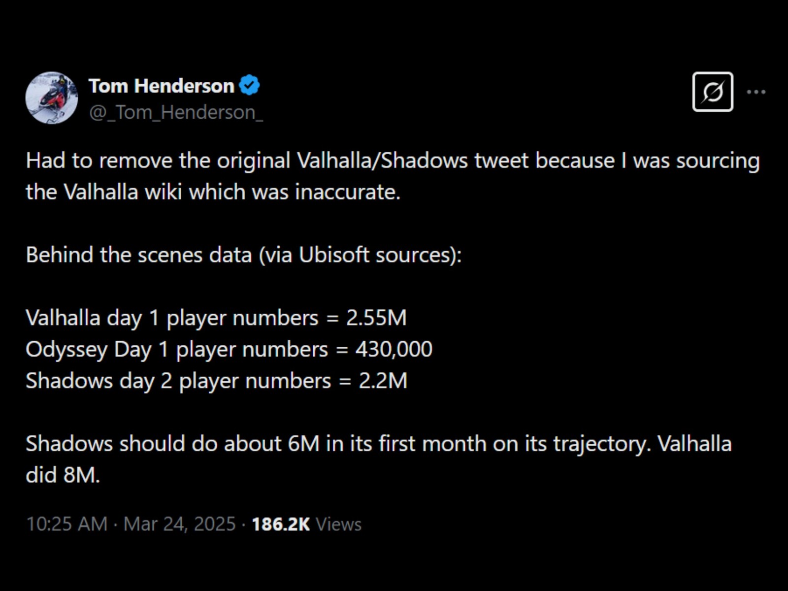 Tom Henderson van Insider Gaming merkt op dat Valhalla in november 2020 werd gelanceerd tijdens de pandemische hausse in de verkoop van videogames. Naarmate de maanden vorderen, kan Shadows de rol van beste Assassin's Creed-game overnemen.