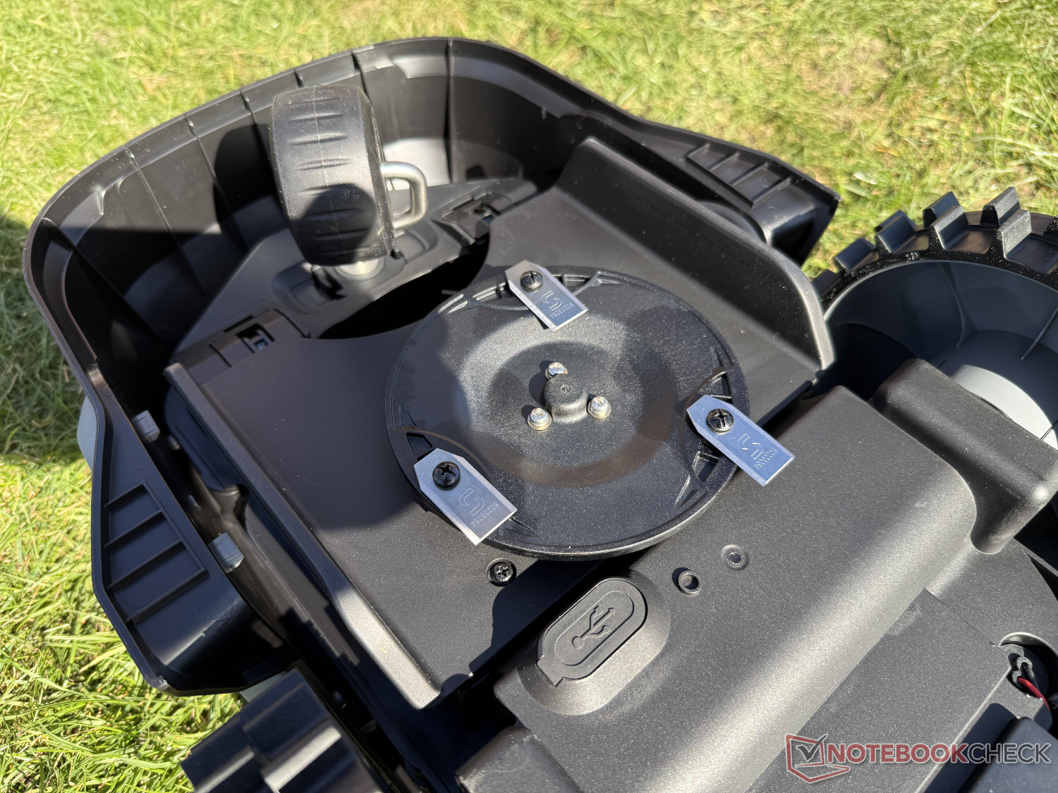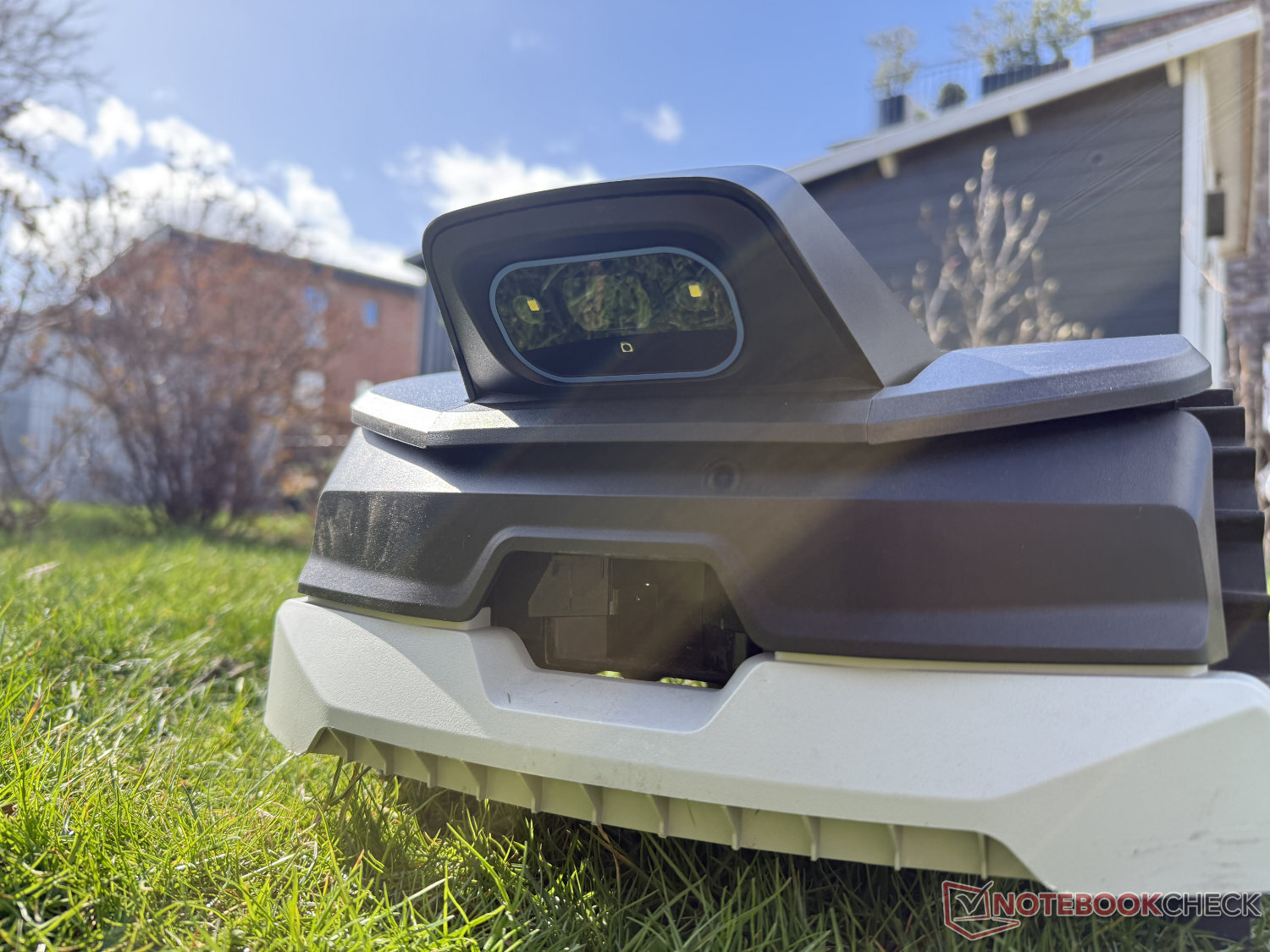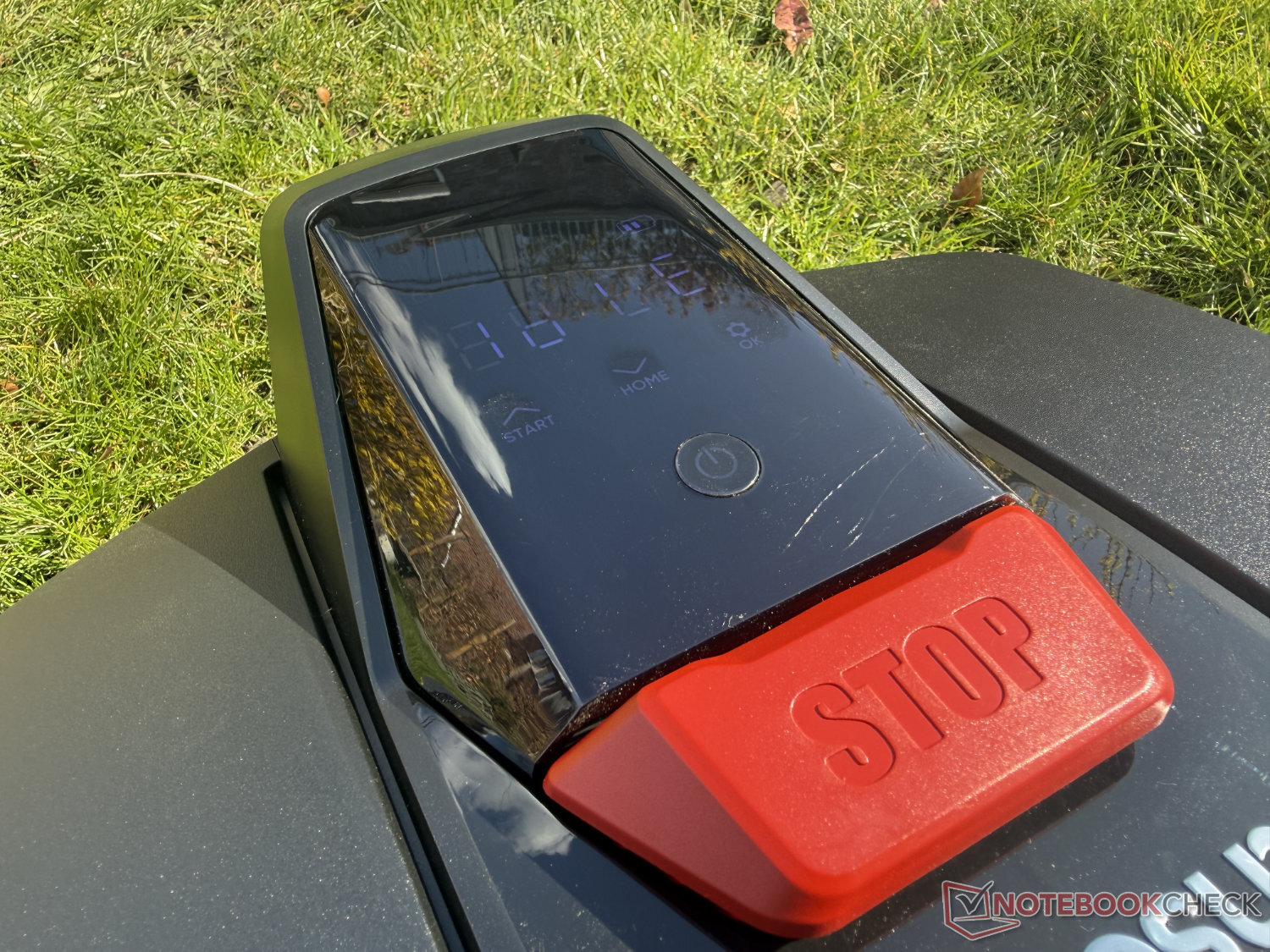 Een blik op de onderkant laat echter zien dat dit niet het geval is. Hier bevindt zich de maaischijf, die echter ook zeer compact is met een maaibreedte van 16 cm. De maaihoogte kan worden ingesteld tussen 20 en 50 mm, maar alleen handmatig in overeenstemming met de prijsklasse. Naast de bedieningseenheid bevindt zich aan de bovenkant ook de naar voren gerichte camera voor navigatie, die we hieronder zullen bespreken.