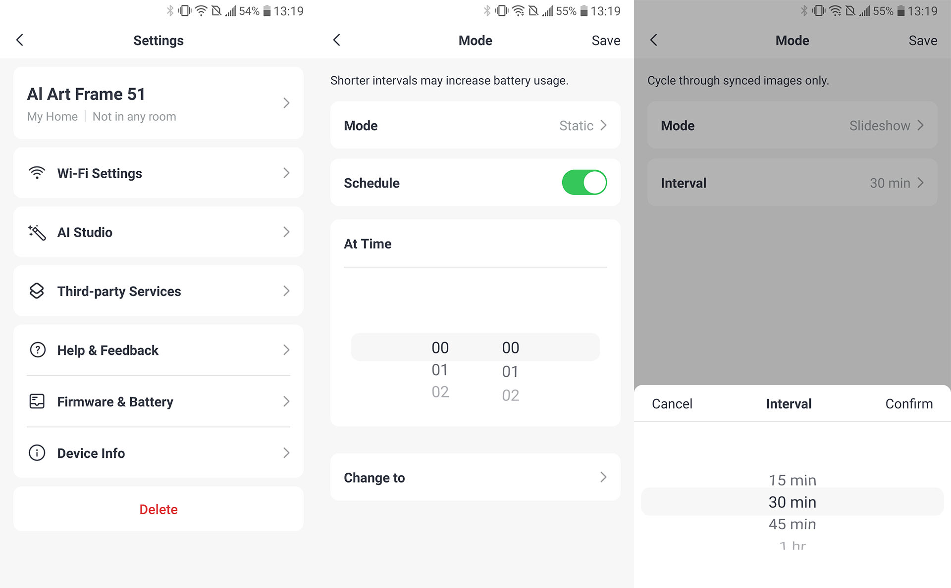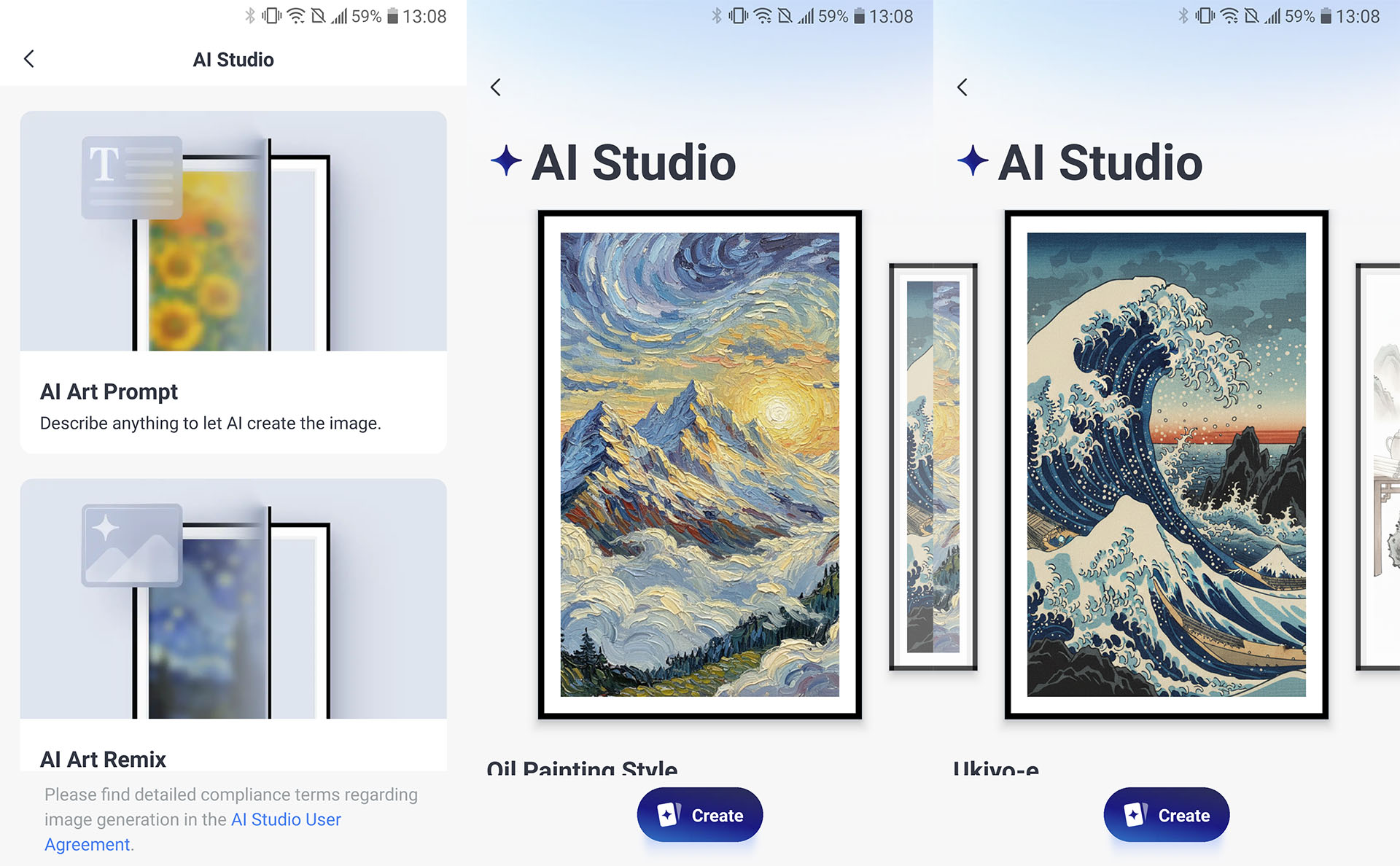 Gebruikers kunnen afbeeldingen synchroniseren vanuit hun fotoalbum, de gratis klassieke artworkgalerij en de AI artgalerij. Er kunnen maximaal 10 afbeeldingen worden geüpload en ingesteld om op een bepaalde tijd of met een bepaald interval te veranderen.