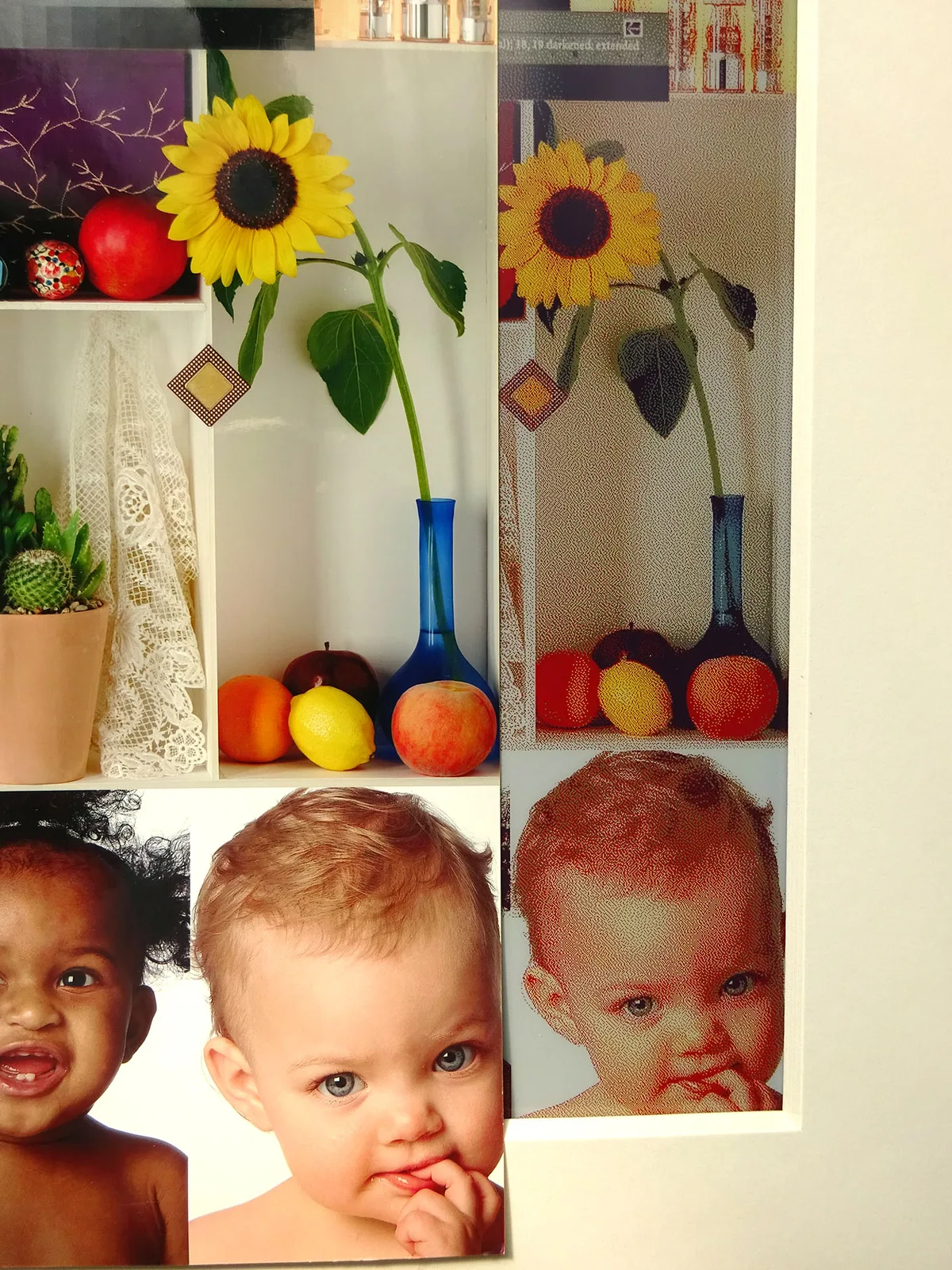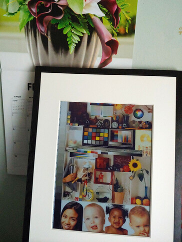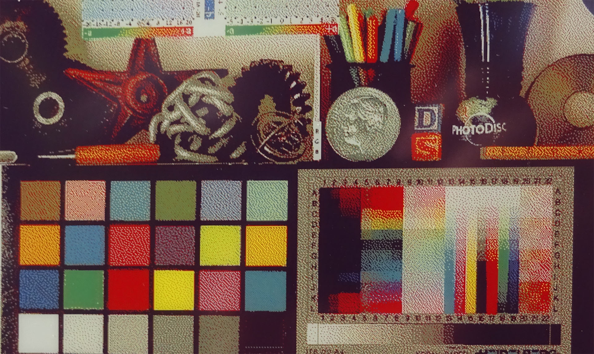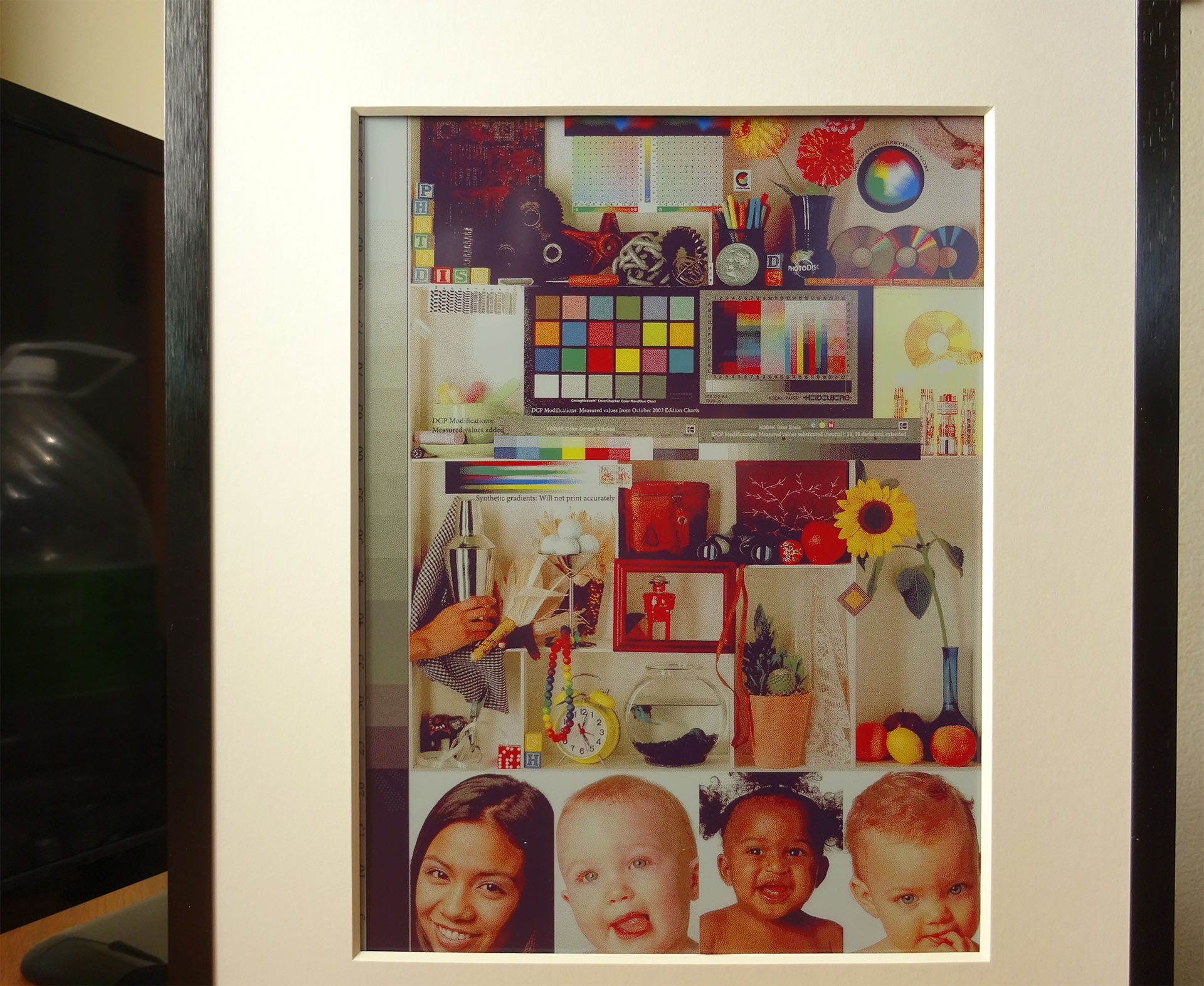 Een vergelijking met een Photodisc testfotoprint benadrukt de beperkingen van het E Ink Spectra 6 paneel. De achtergrond is niet zuiver wit, waardoor schaduwdetails en maximaal contrast worden beperkt. Het kleurengamma is ook beperkt, vooral in het groen en blauw.