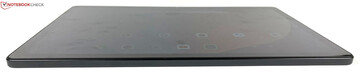 De Teclast tablet, die met een dikte van slechts 8,2 mm mooi slank is, is niet het meest lichtgewicht door zijn XXL formaat - we hebben 710 gram gemeten. Toch zorgen de randen (1 cm breed) ervoor dat u de tablet comfortabel kunt vasthouden zonder per ongeluk het touchscreen te activeren. De volumeknop en aan/uit-knop zijn een beetje zijdelings buigbaar en hebben een duidelijk drukpunt.