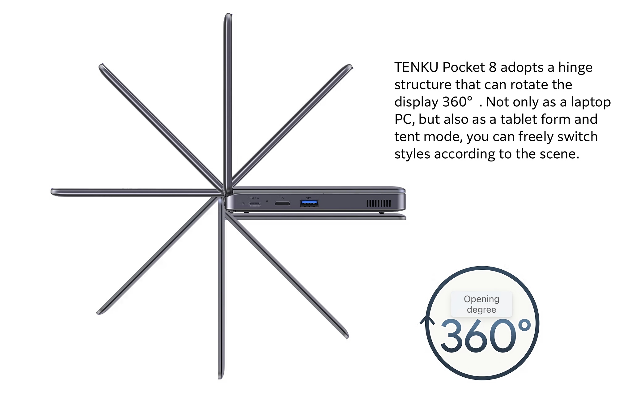 Met een gewicht van iets meer dan 650 gram of 1,43 pond is de Pocket 8-laptop uiterst compact, met afmetingen van slechts 20 x 13 x 1,8 cm of ruwweg 7,8 x 5,1 x 0,71 inch. Andere opvallende kenmerken zijn een accu van 3.800 mAh, een 360° scharnier en een 10-punts aanraakscherm.