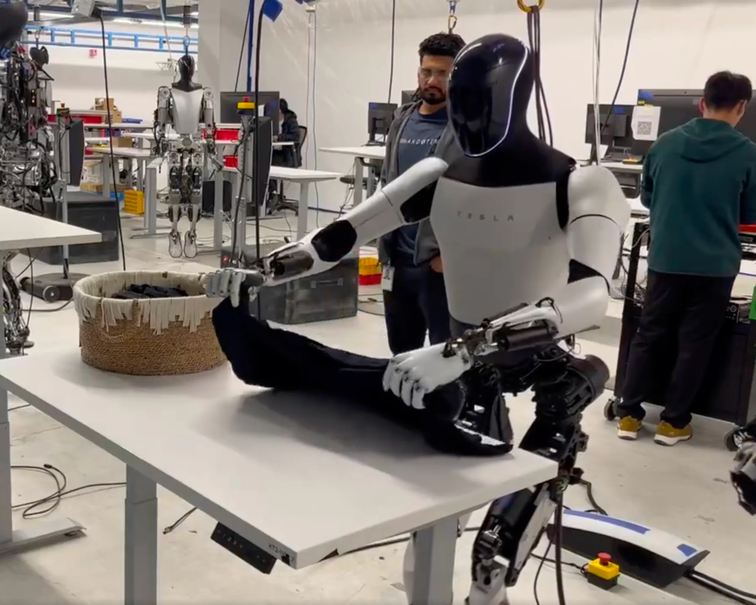 In de nieuwste video op X (voorheen Twitter) is te zien hoe Optimus Gen 2 een T-shirt uit een mand haalt, het voorzichtig op een tafel legt en het kledingstuk vervolgens met relatief delicate bewegingen opvouwt en opzij legt. Wat de video echter niet laat zien, is dat een verborgen werknemer rechts in beeld de robot op afstand bestuurt met een soort bedieningshandschoen, en de robot lijkt zijn bewegingen na te bootsen.