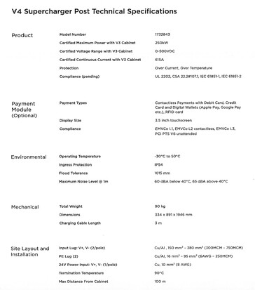 Helaas bevestigt Tesla 250 kW vermogen voor zijn V4 Superchargers, hoewel het de nodige verduidelijking geeft dat dit "het gecertificeerde maximale vermogen is met een V3-kast." Een V3-kast is voorlopig echter alles wat geïnstalleerd wordt. Volgens Drew Baglino van Tesla zullen de V4-palen, wanneer ze geüpgraded worden naar hun nominale vermogen van 350 kW, in staat zijn om opladen de 800V Cybertruck in minder dan 20 minuten opladen.