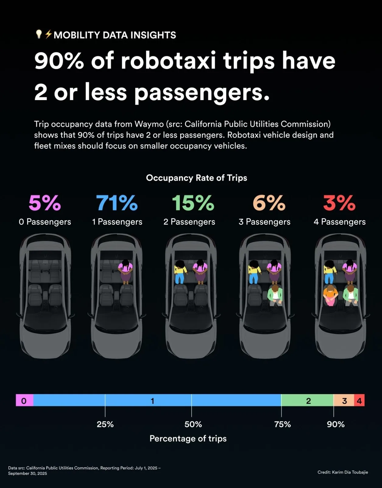 Het concept met twee zitplaatsen is nu gerechtvaardigd door de nieuwste statistieken over de bezettingsgraad van Waymo. Het blijkt dat 90% van de bestuurderloze ritten in een robotaxi met één of twee personen worden gemaakt. De overgrote meerderheid daarvan rijdt ook met slechts één persoon, terwijl slechts 9% minstens één persoon op de voorstoelen heeft.