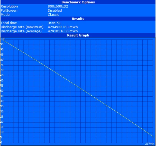 De maximale batterijduur, bij minimale helderheid, WLAN en Bluetooth uitgeschakeld en Windows energiebesparende profiel ingeschakeld, bedroeg 450 minuten in de BatteryEater Reader's test. Dit is ongeveer 7.5 uur.