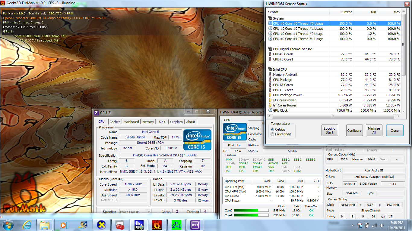 Met HWiNFO zijn geen beperkingen aangetroffen terwijl FurMark en Prime95 tegelijk draaiden. Turbo Boost was alleen de eerste minuten van kracht, maar beide cores bleven uiteindelijk constant op 1,595 GHz. De Intel HD 3000 had een maximum van 1150 MHz met Turbo Boost, maar bleef daarna constant op 700 MHz tot 750 MHz. Er zijn geen beperkingen aangetroffen op het gebied van de GPU. De 3DMark 06 CPU score na de stress zat erg dicht bij de originele score van 2409 punten.