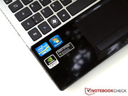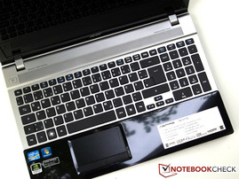 De buitenkant van de behuizing doet ons sterk denken aan die van zijn grote broer, de Aspire V3-771G. De zwarte hoogglans afwerking van verschillende oppervlakken zorgt direct na het uitpakken voor sensatie. Deze afwerking van het schermcover, de rand rond het scherm en het gebied onder het toetsenbord is een echte eye-catcher, maar na de notebook kort gebruikt te hebben zitten de oppervlakken onder de vingerafdrukken en stofjes. Het plakkerige gevoel past bij het materiaal, maar is niet echt fijn. Gelukkig geldt deze kritiek niet voor het met een zilveren rand omringde toetsenbord, dat de V3 een elegante touch geeft, en ook niet voor de de matte, iets ruwere toetsen. Het gebruik van materialen van hogere kwaliteit zou wenselijk zijn, maar gezien de lage instapprijs is deze materiaalkeuze ook prima.