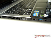 Minder optimaal is, althans volgens ons, de positie van de poorten. Bijna alle poorten bevinden zich namelijk dichtbij de voorzijde van de notebook. Ze zijn daardoor wel gemakkelijk bereikbaar en zichtbaar, maar afhankelijk van de hoeveelheid aangesloten randapparatuur kunnen kabels de werkruimte links en rechts van de notebook beperken. Verder hoeven linkshandigen bij het gebruik van een externe muis niet bang te zijn voor een koude hand: aan de linkerzijde bevindt zich namelijk de fan die warme lucht uit de behuizing blaast.