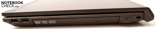 Rechts vinden we de twee resterende USB 2.0 poorten, de DC-in en de geïntegreerde DVD Super Multi DL brander (dual layer) van LG. Acer heeft nog getwijfeld over andere interfaces, zoals FireWire of eSATA, voor randapparatuur. En er kan verder op dit gebied niets anders worden aangesloten omdat er geen ExpressCard slot aanwezig is.