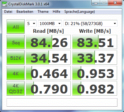 De toegangstijden van 0,5 ms (lezen) en 2,5 ms (schrijven) zijn ook schaars. SSD's zitten hier meestal tussen de 0,1 en 0,3 ms. We hadden nauwelijks het besef dat er een SSD was geïnstalleerd tijdens praktisch gebruik. Opstarttijden, laadtijden en gegevensoverdracht waren subjectief niet veel sneller dan een snelle 7200 rpm HDD - verloren potentieel.