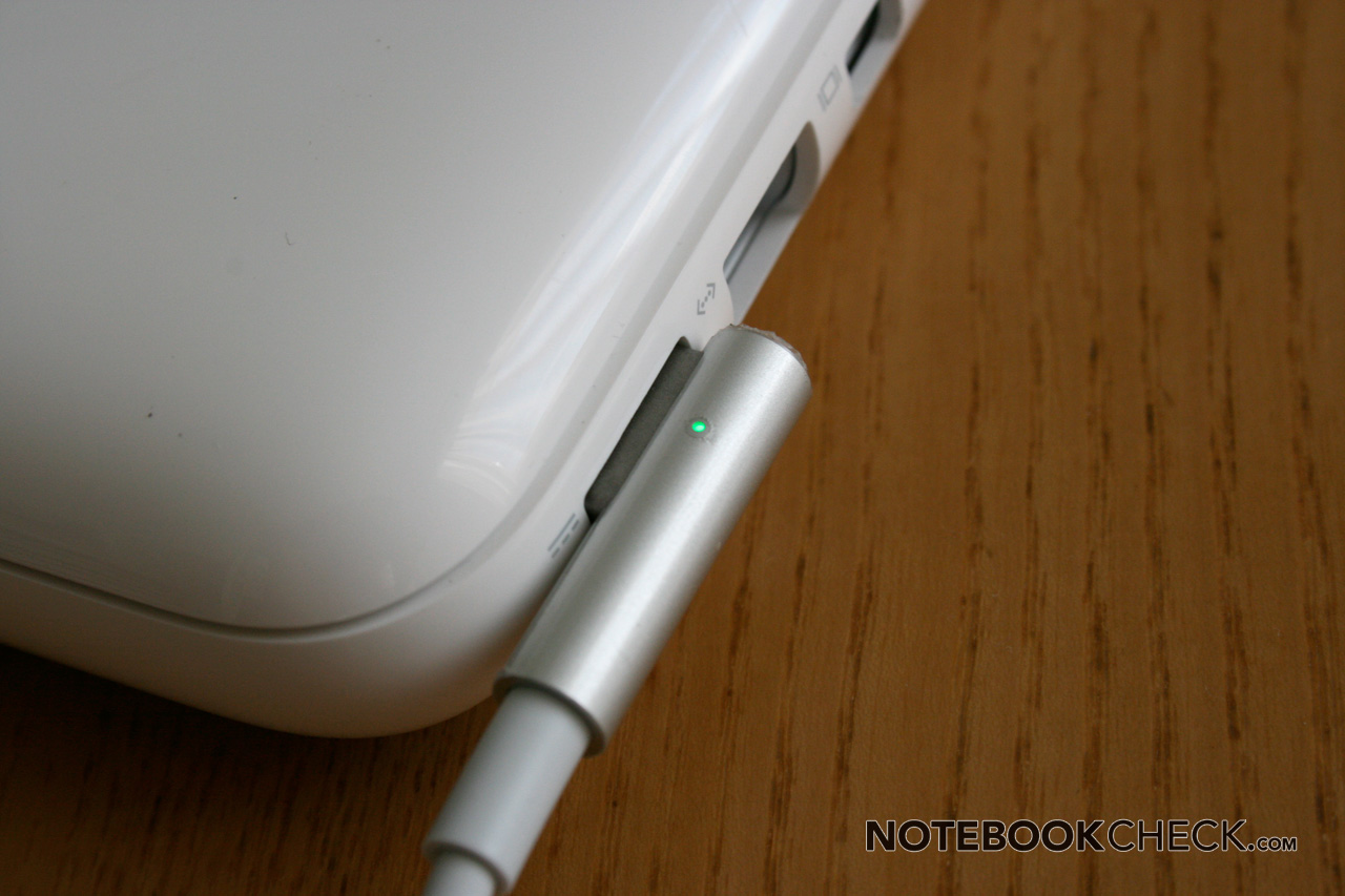 Het magere aanbod van poorten is ook onveranderd in dit plastic MacBook model. In totaal zijn er slechts 6 poorten, allen bevinden zich achteraan de linker zijde van de notebook. Het hoogtepunt is de mini DisplayPort welke gebruikt kan worden om monitoren tot wel 30" aan te sluiten. Een nadeel is dat voor het overgrote gedeelte van de schermen een adapter gekocht moet worden om ze aan te kunnen sluiten.