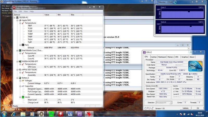 De interne temperaturen na een aantal uur extreme belasting zijn slechts lichtelijk aan de kritieke kant voor de grafische kaart volgens de geïntegreerde sensors. Dit is echter wel nadat de laptop tot het uiterste is gedreven met een constante Furmark test. De twee processors zitten ver van hun theoretisch maximum (105°C volgens Intel) met een temperatuur van 78°C volgens de interne sensors.