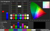 Op het gebied van kleurreproductie, gemeten met fabrieksinstellingen onder Mac OS, presteert het beeldscherm behoorlijk goed. In de grijsschaal hebben we een gemiddelde DeltaE 2000 van 7,26 gemeten met een maximale afwijking van 10. De kleur blauw is in verhouding iets te sterk (DeltaE 2000 meer dan 15). De kleurverzadiging is vooral bij hogere niveaus niet optimaal. Hier zijn blauw, magenta en rood te sterk. Op lagere niveaus blijft het beeldscherm goed presteren.