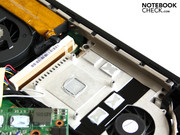 De textuur op de buitenkant en de palmsteun maken een punten-patroon. Deze is alleen van dichtbij te herkennen. De gebruiker kan met de hand testen hoe stijf het chassis is. We konden de behuizing met beide handen buigen, maar slechts een beetje. De onderkant en zijkanten zijn gemaakt van grof plastic. Alhoewel de poorten aan de zijkant zijn verzonken konden wij via het onderpaneel bij de notebook naar binnen kijken. Na het losmaken van enkele schroeven konden we het paneel verwijderen en hadden wij toegang tot de interne hardware. Meer daarover in de foto-montage.