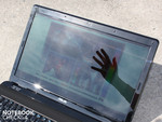 Wie zijn 17,3-incher mee naar buiten wil nemen, is bij ons testmodel aan het verkeerde adres. Het beeldscherm heeft geen AR-coating (glans-type) en spiegelt snel. De lage verlichting van 190 cd/m2 kan ook niet veel uitrichten tegen de spiegelingen. De gebruiker heeft nauwelijks een kans op adequaat zicht met de K72JK, vooral in direct zonlicht. Door de moeilijk schoon te maken glanzende oppervlakken en het gewicht van 3168 gram plus 463 gram voor de adapter zal het idee van dit notebook als mobiele metgezel snel naar de achtergrond verdwijnen.