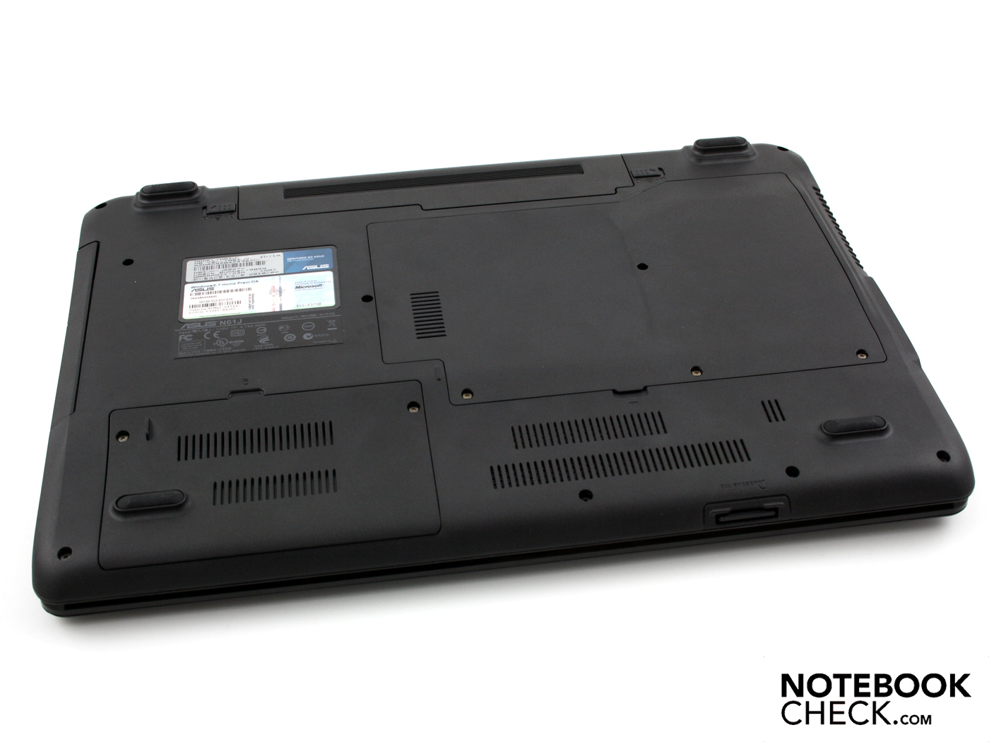 De onderzijde is gemaakt van simpel plastic en kan enkel bij de kleppen worden ingedrukt. Beide kleppen zorgen ervoor dat de harde schijf, RAM of WLAN module kan worden bereikt. Dit geldt ook voor de Core i5 processor. Hij is standaard aanwezig en kan worden verwijderd na het verwijderen van de heatpipe.