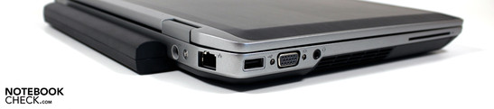 Hoe zit het met de poorten en plaatsing daarvan op de E6420? Vooral de plaatsing springt namelijk in het oog wanneer je voor het eerst naar de notebook kijkt. Ze bevinden zich namelijk rond de achterste hoeken. Aan de linkerzijde, meer naar voren, vinden we het Smartcard slot gevolgd door een luchtuitlaat, hoofdtelefoon/microfoon combopoort, VGA poort en een USB 2.0 poort. Om het hoekje, aan de achterkant, zit een RJ45 Ethernet poort en de aansluiting voor de adapter.