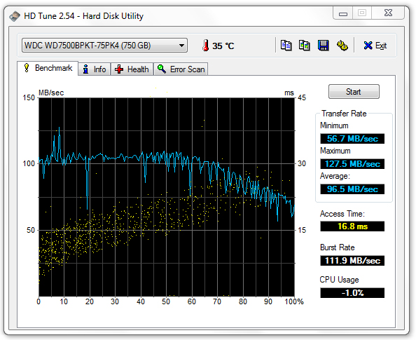 Wanneer je de Seagate schijf vergelijkt met zijn concurrenten, bevind deze zich onderin de middenklasse van 7200 rpm harde schijven die we getest hebben, terwijl de WD harde schijf indrukwekkender is met goede benchmark resultaten in de HDTune test. De erg merkbare vibraties in ons preproductiemodel vinden we niet terug in het productiemodel. Wel is het geluid van de HDD vaak luider dan de ventilator, zodat het notebook altijd duidelijk hoorbaar is.