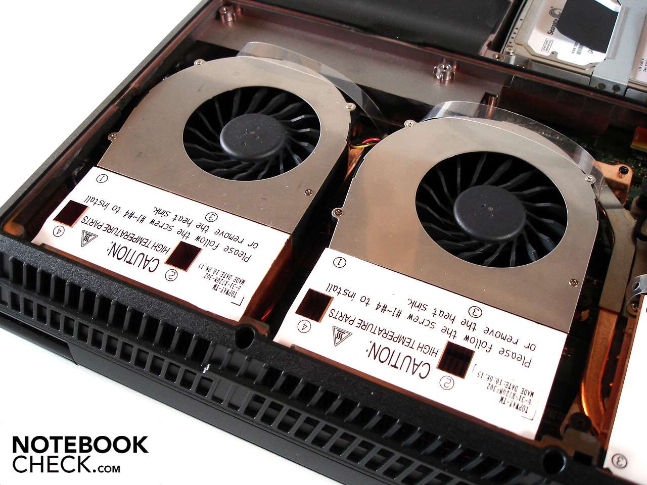 Net als de prestaties, zijn de koelingseisen van de high-end componenten van een erg hoog niveau. De barebone fabrikant, Clevo, vertrouwt op vier ventilatoren voor het afvoeren van overvloedige warmte. Maar Clevo's ventilator instellingen falen helaas (alweer) volledig. De ventilatoren draaien al op volle snelheid tijdens het bootproces en doen bijna denken aan een vliegtuigmotor. Zodra het besturingssysteem geladen, daalt het systeem geluid merkbaar. De desktop vervanger is echter op geen enkele manier stil.