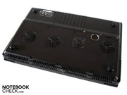 De erg uitgebreide aansluitingen zijn absoluut verbazingwekkend. Met uitzondering van een ExpressCard-slot en een VGA-poort, heeft Clevo elke voorstelbare aansluiting die je kunt verwachten van een volwaardige desktop vervanger. Terwijl de voorkant compleet vrij is van aansluitingen en de achterzijde enkel plaats biedt aan de voeding aansluiting, zijn de zijkanten rijkelijk uitgerust. De rechterzijde beschikt dan ook niet enkel over een Kensington Lock en drie USB 2.0-poorten. Er zijn ook vier audio aansluitingen die een 7.1 surround geluid kunnen weergeven.