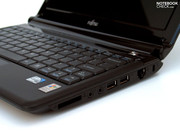 Fujitsu heeft gelukkig voor een matte afwerking van de polssteunen gekozen, maar het hoogglans gebied begint boven het toetsenbord. De hoogglans afwerking ziet er misschien prachtig uit als de netbook net uit de verpakking komt, maar na korte tijd zit de behuizing onder de vingerafdrukken en stofdeeltjes. Je zult dan ook vaak in de weer zijn met een poetsdoek. Vervelender is dat de behuizing ook gevoelig is voor permanente krassen, die gemakkelijk ontstaan tijdens mobiel gebruik. Zelfs ons testexemplaar begon al gebruikssporen te vertonen.