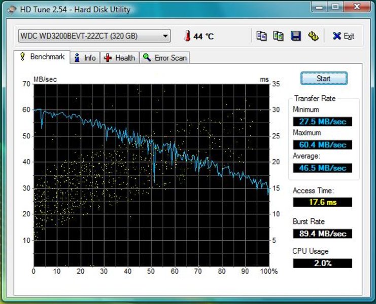 Ons testmodel was uitgerust met een 320 Gigabyte Serial-ATA harde schijf van Western Digital (WD), een Scorpio Blue WD3200BEVT. In de harde schijf test HD Tune haalde deze 5400 rpm harde schijf een gemiddelde dataoverdracht snelheid van 46.5 MB/s. Elke harde schijf is uitgerust met een schok-sensor, die de harde schijf moet beschermen tegen schok-gerelateerde schade. Voor extra opslag is onze U9210 standaard uitgerust met een optische drive in het Ultrabay slot, namelijk een HL-DT-ST DVDRAM GSA-T50N van LG. Voor professionele data bescherming ondersteunt de GSA-T50N ok het belangrijke DVD-RAM format.