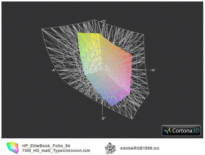 Gebruikers die op professioneel niveau aan beeldbewerking doen zullen teleurgesteld zijn in het HD scherm, want het sRGB kleurenspectrum kan bijvoorbeeld niet geheel worden weergegeven. Dat geldt niet voor alle ultrabooks, zoals in de vergelijking van de ThinkPad X1 Carbon (HD+) en Folio 9470m is te zien (grafiek 3).