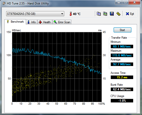 Om precies te zijn, de Envy 17 3D bevat een Seagate ST9750420AS, hetzelfde model als in de recent geteste Envy 14-2090eo. Deze levert een gemiddelde overdrachtssnelheid van 92.7 MB/s en 15.2 ms toegangstijd volgens HD Tune - een veel beter gemiddelde dan de meeste 5400 rpm variaties kunne bieden. In Crystal Disk Mark haalt de Seagate 102.9 MB/s in sequentieel lezen en 96.4 MB/s in sequentieel schrijven.