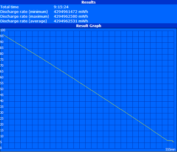 In het ander uiterste scenario bepalen we de theoretische maximum batterijduur. Dit doen we met het Power Saver profiel, minimaal helderheidsniveau, draadloze modules uitgeschakeld en de Battery Eater Pro Reader's test. De ultrabook zet in deze test een tijd neer van 9 uur en 15 minuten.