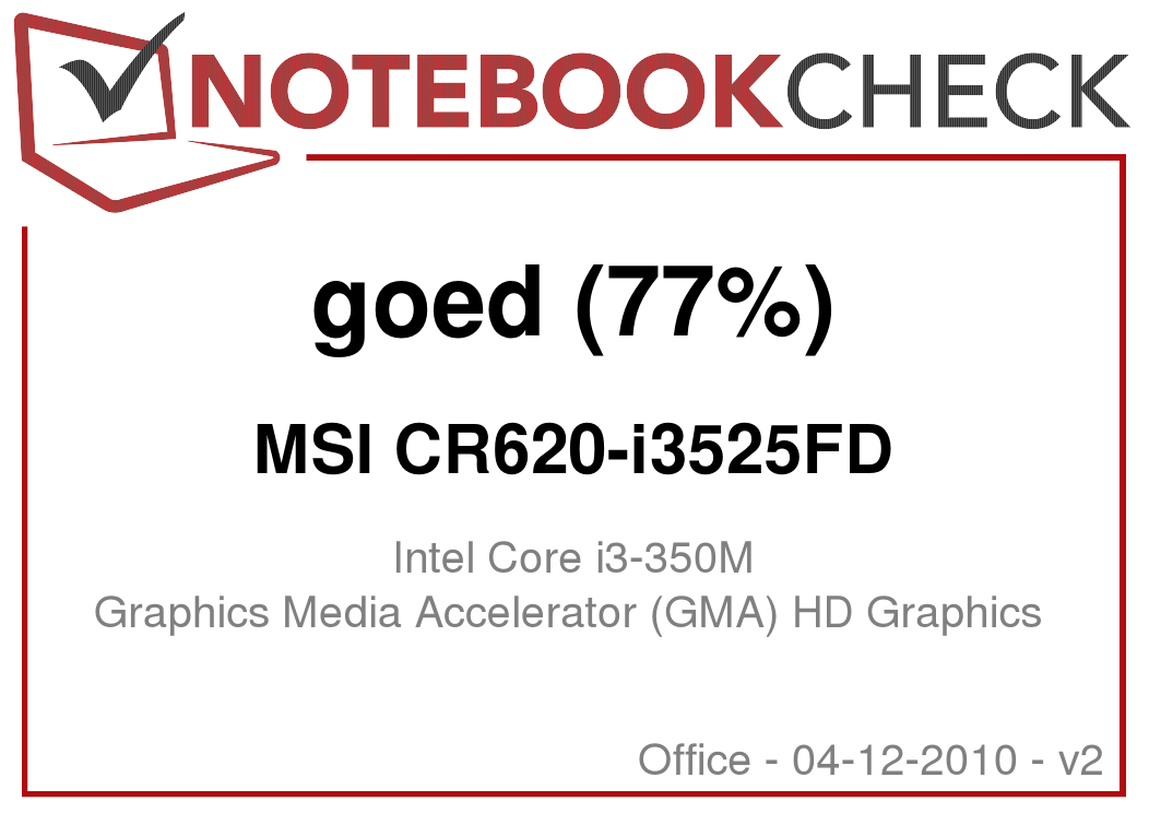 De 15.6 inch MSI CR620-i3525FD is schappelijk geprijsd (vanaf €470), maar heeft wel zijn plus- en minpunten. Het eerste pluspunt zijn de goede prestaties van de Core i3-350M (2.26 GHz), die genoeg heeft aan de 2 GB RAM geheugen. De geluidsproductie en warmteontwikkeling tijdens normaal office gebruik zijn ook erg laag en zelfs tijdens zware belasting blijft de CR620 koel genoeg om er op schoot meet te kunnen werken.