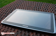 Door de parelgrijze kleur, lijkt de Galaxy Note 10.1 op het eerste gezicht een beetje op een grijze muis tussen de andere tablets. Het simpele design met de zilvergrijze randen is zeker tijdloos. Met betrekking tot de materialen hebben de Koreanen gekozen voor een hoge kwaliteit plastic buitenkant, met uitzonder van het touchscreen, die onder een relatief robuste glazen plaat ligt. De achterkant van de tablet heeft een donkere grijze kleur dan de rest, met uitzondering van de bovenkant waar de camera zit. Op de fabricagekwaliteit is niks aan te merken. Dankzij de afgeronde randen en het bescheiden gewicht van ongeveer 600 gram voelt de 10,1 inch tablet goed aan. Als er veel druk wordt uitgeoefend op de achterkant van de tablet dan buigt het oppervlak behoorlijk door. Maar tijdens dagelijks gebruik is de Galaxy Note voldoende stevig. Met een hoogte van 8,9 millimeter is het als een dun tablet te kwalificeren.