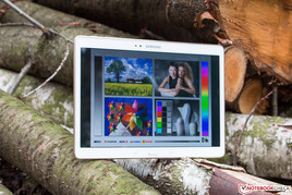 Veel mensen zullen de kleurreproductie van een AMOLED beeldscherm als oververzadigd ervaren. Samsung's ontwerpers hebben echter alweer juist gehandeld. De kalibratie van het beeldscherm is zeer eenvoudig. In zowel het sRGB als het Adobe-RGB kleurenspectrum zijn er nauwelijks afwijkingen te bekennen. Dit wordt bevestigd door DisplayMate, die een volledige dekking van beide spectra aangeeft. Hierdoor is de tablet geschikt voor professioneel gebruik. Dit is een unieke prestatie, aangezien de iPad Air alleen het kleinere sRGB kleurenspectrum bedekt.