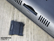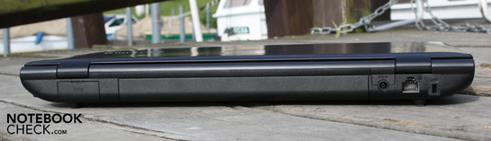 Linkerkant: naast de HDMI en VGA poort, voor het aansluiten van externe monitoren of TV's, bevindt zich een eSATA poort (gecombineerd met USB). Deze poort is handig om snelle, externe harde schijven aan te sluiten. De opening voor de poort is niet heel netjes uitgesneden, maar de poort werkt prima. Aan de linkerkant treffen we ook nog een USB 2.0 poort aan, waarvan er ook nog twee aan de rechterkant zitten. Alle USB 2.0 poorten kunnen worden gebruikt om apparaten, zoals smartphones, op te laden (zelfs als de notebook uit staat). Dit beperkt dus meteen het aantal adapters dat je onderweg mee hoeft te slepen.
