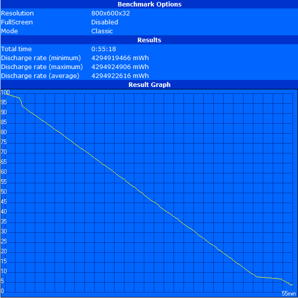 Het testapparaat hield het iets langer dan drie uur vol met Battery Eater's Reader's test met minimale helderheid, energiebesparingsopties ingeschakeld en draadloze modules uitgeschakeld. Dit is echter geen praktisch voorbeeld voor de doelgroep aangezien de helderheid erg laag is en er geen gebruik kan worden gemaakt van Wi-Fi. De looptijden namen af tot 2 uur bij de Internet test. Hierbij is de helderheid hoger en zijn de draadloze modules ingeschakeld. De batterij hield het slechts 1:21 uur vol als draagbare TV (DVB-T ontvanger, maximale helderheid en uitgeschakelde Wi-Fi). Het TV programma kan dus alleen afgekeken worden als er een adapter in de buurt is. Bij maximaal energieverbruik is de batterijlevensduur 55 minuten (maximale helderheid, Hoge Prestaties, draadloze modules ingeschakeld).