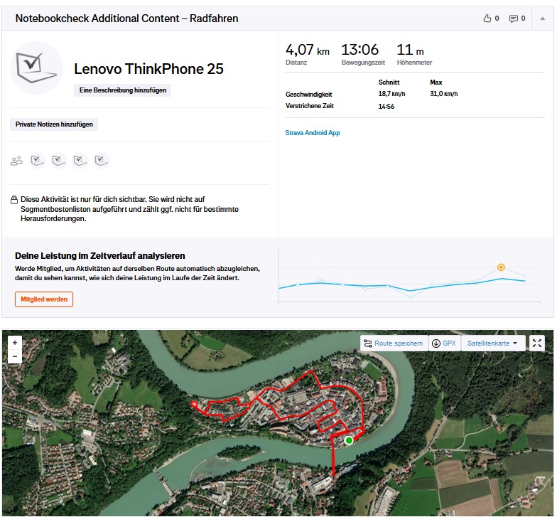 Om de trackingnauwkeurigheid in de praktijk te beoordelen, namen we de ThinkPhone 25 mee op een korte fietstocht. We namen de route parallel op met een Garmin Venu 2 ter vergelijking. Over het algemeen vonden we de trackingcapaciteiten vrij goed, maar de afwijkingen op onze testroute werden bij nader inzien frequenter.
