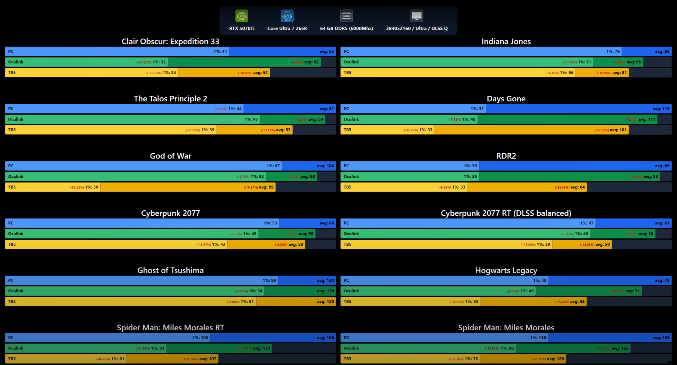 Als gevolg hiervan is de Peladn Link S-3 beperkt de GeForce RTX 5070 Ti merkbaar minder frames per seconde dan wanneer dezelfde GPU via OCuLink op een apparaat is aangesloten of in een desktopsysteem wordt gebruikt. Niet alleen dat, maar 1% FPS laagtes worden meer overdreven over Thunderbolt 5, wat aantoonbaar ook leidt tot een minder vloeiende spelervaring.