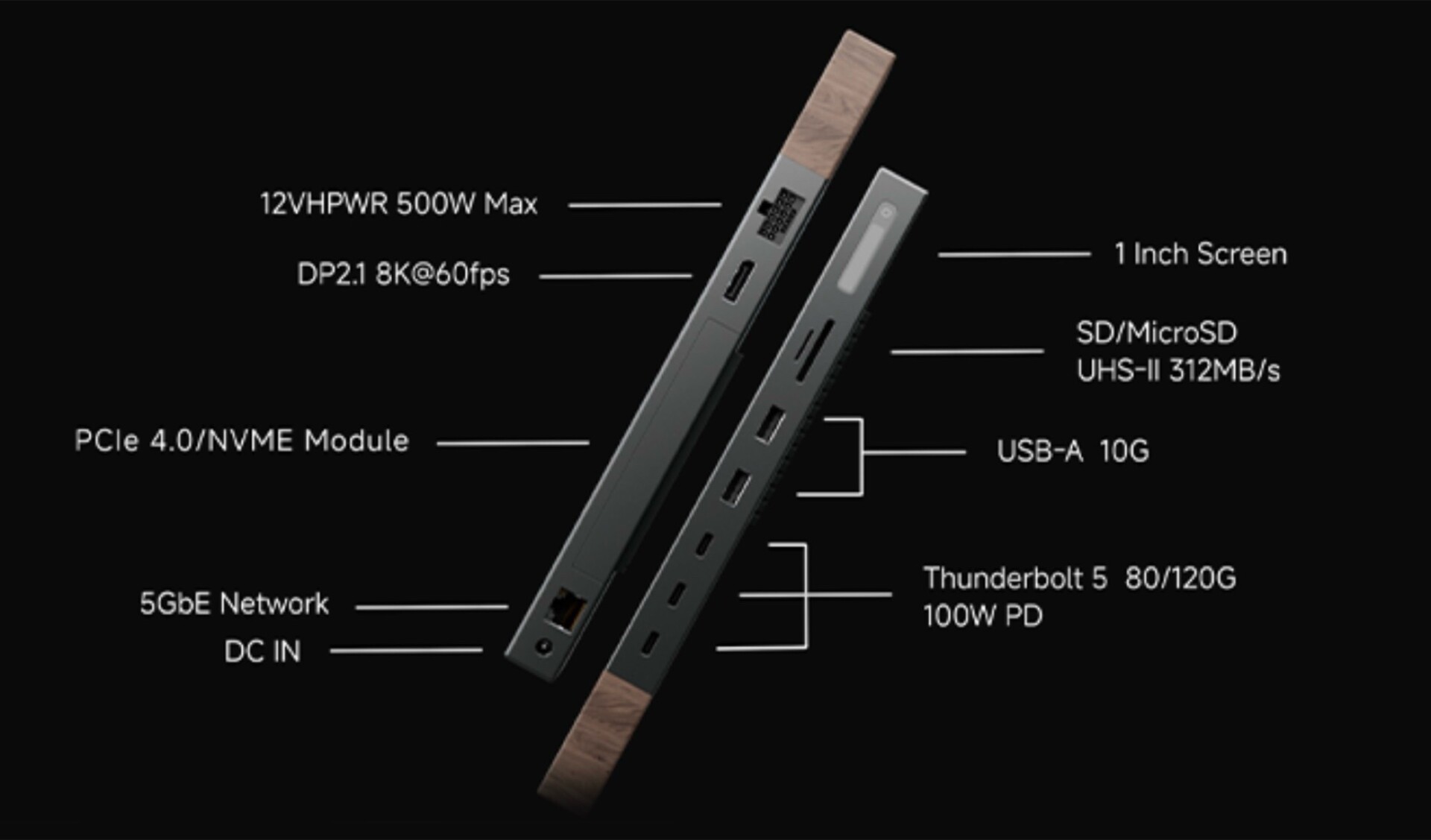 Aangesloten laptops kunnen met maximaal 100 watt worden opgeladen, terwijl een 1-inch display de huidige status van het dock weergeeft. De meest ongebruikelijke functie is waarschijnlijk de verborgen PCIe-sleuf onder het deksel aan de bovenkant, waardoor de gebruiker een gewone desktop-GPU kan aansluiten in combinatie met een 500-watt PSU. De grafische kaart wordt aangesloten via PCIe 4.0 x4.