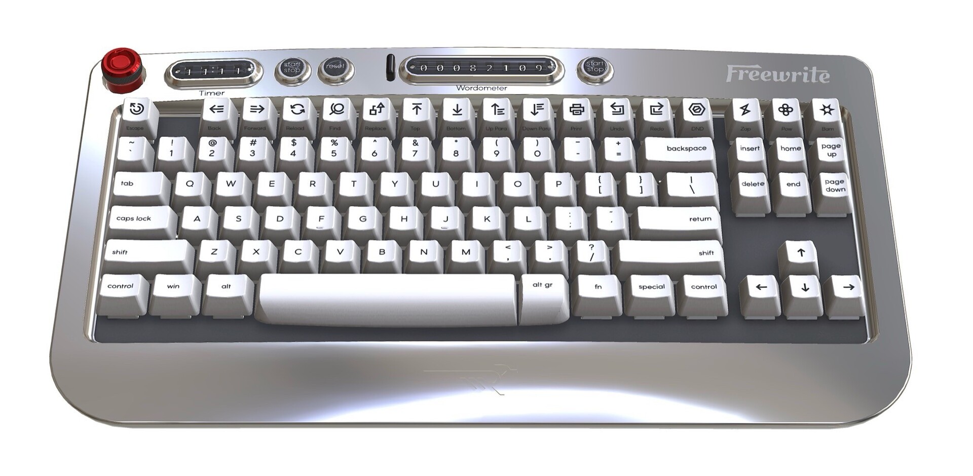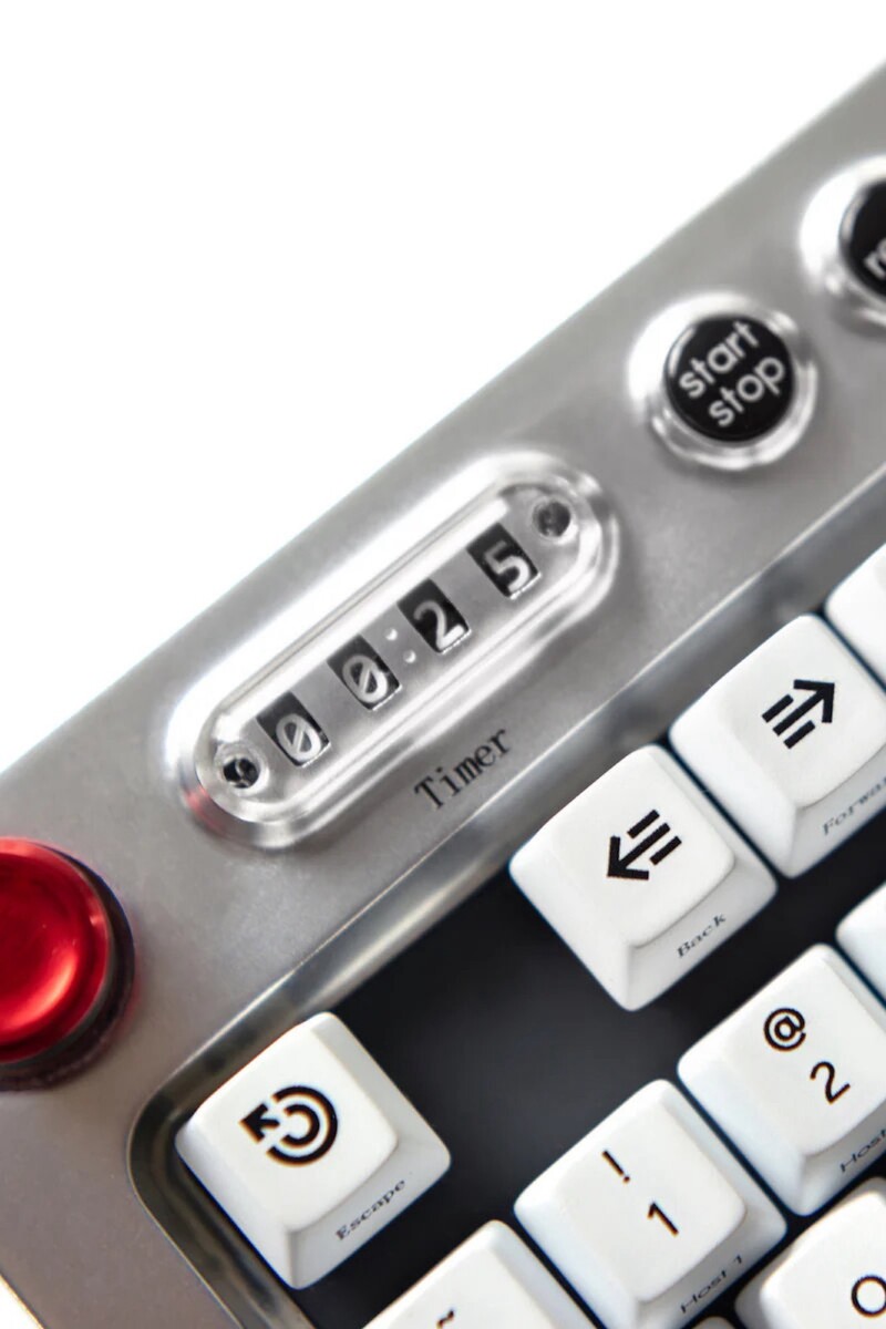 Op het eerste gezicht ziet de Freewrite Wordrunner eruit als een volwaardig mechanisch toetsenbord zonder numpad. De opvallendste eigenschap zijn de twee displays aan de bovenkant van het invoerapparaat. Eén daarvan toont een timer voor korte schrijfsessies. De duur kan na elke reset handmatig worden ingesteld.
