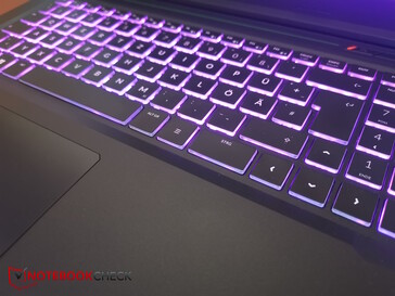 Het toetsenbord heeft een standaardindeling; alles is verdeeld over zes rijen en niets wijkt af naar de boven- of onderkant van het apparaat. Aan de rechterkant bevindt zich een numeriek toetsenblok. De basis van het drie niveaus verlichte (1-zone) toetsenbord is iets verzonken en de toetsen zijn 1,5 x 1,5 cm groot. Hun drukpad is iets langer en zachter dan op veel andere laptops, maar hun feedback is helder genoeg. Hierdoor voelt het toetsenbord minder plat aan dan dat van sommige concurrenten en kunt u er comfortabel en snel op typen. Het typgeluid is matig tot gemiddeld hard en de toetsaanduidingen zijn gemakkelijk te lezen.