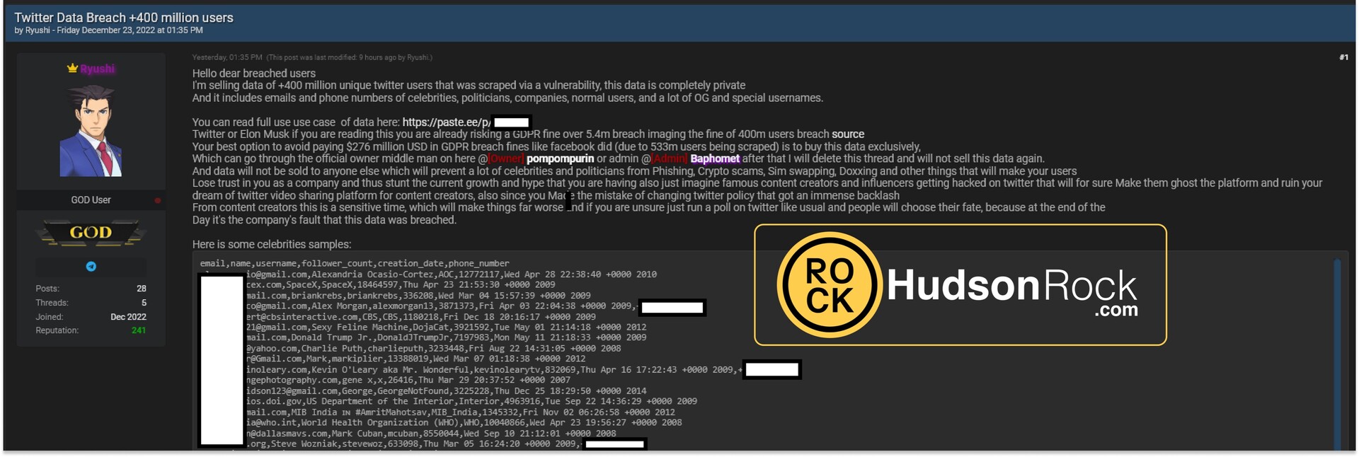 Volgens de "cybercrime intelligence company" Hudson Rockis Twitter het onderwerp geweest van een nieuw datalek waardoor een aanzienlijke hoeveelheid gebruikersgegevens in handen is gekomen van een "bedreigende actor". Dit incident heeft blijkbaar eerder plaatsgevonden in 2022, hoewel de inbreuk in kwestie nu pas openbaar is gemaakt.