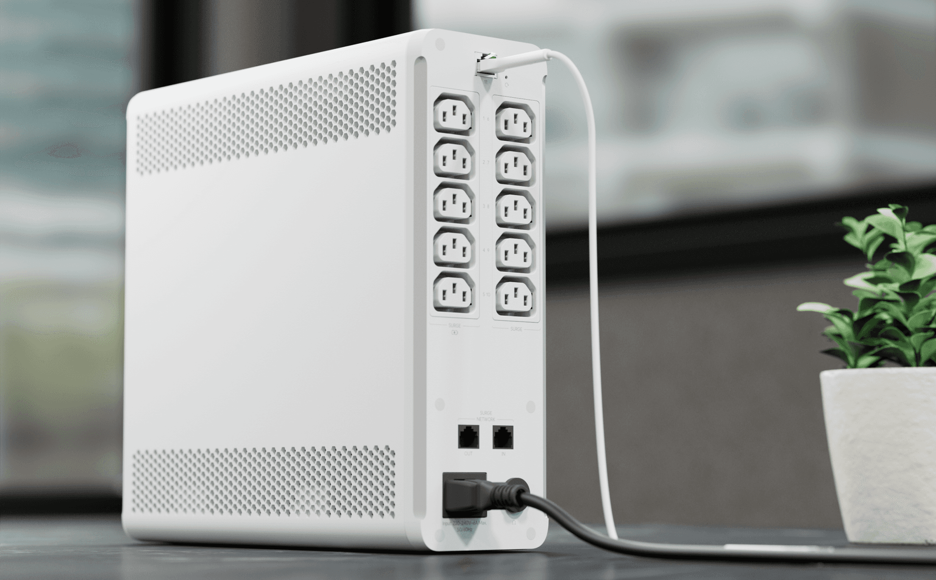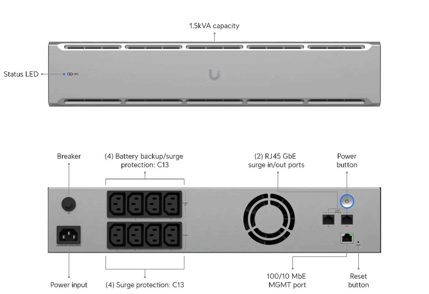 De Unifi UPS Tower is ontworpen om op desktops geplaatst te worden. Naast een netwerkpoort voor Unifi integratie en overspanningsbeveiliging voor netwerkverbindingen via GbE, biedt de toren in totaal tien C13 poorten voor C14 stekkers. Alle poorten zijn beveiligd tegen overspanning, en vijf van deze poorten worden bovendien ondersteund door de interne batterij voor een continue stroomvoorziening.