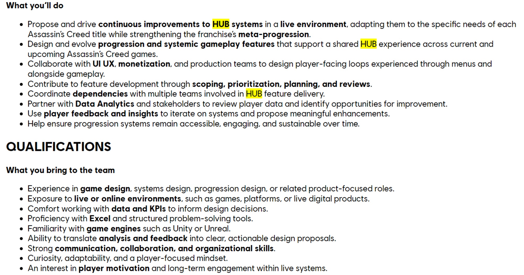 De ontwikkelaar is gevestigd in Quebec City en zou Progressie en Systemen in Assassin's Creed-games optimaliseren. Verwijzend naar de Animus Hub launcher, die meerdere titels met elkaar verbindt, roept de vacature op tot "voortdurende verbeteringen aan HUB-systemen in een live-omgeving"