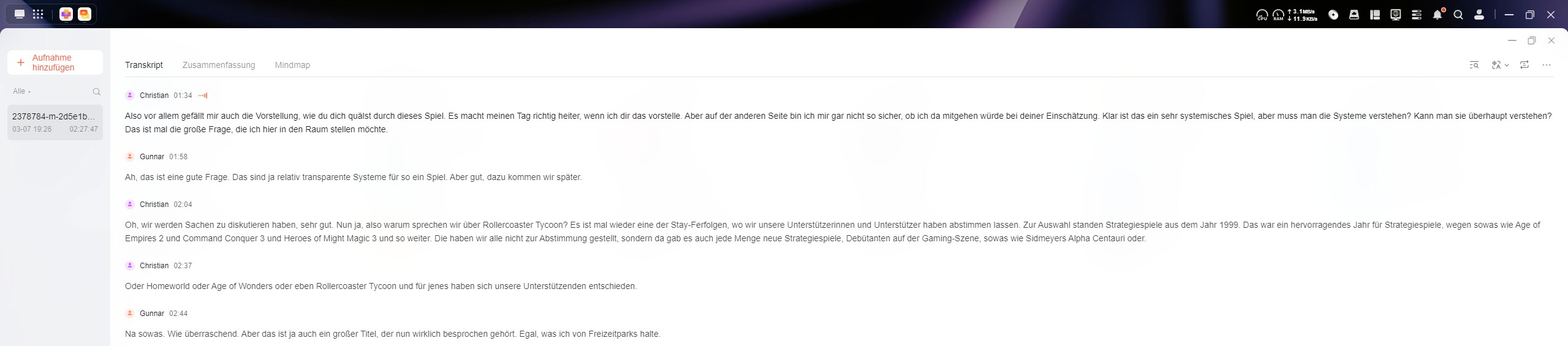 Met behulp van een applicatie kunnen audiobestanden getranscribeerd en samengevat worden. We hebben deze functie in detail geëvalueerd aan de hand van aflevering 161 van de Stay Forever podcast. De podcastaflevering is iets minder dan 2 uur en 30 minuten lang, en de transcriptie duurde 10 minuten. Het transcript is zeer bruikbaar. Langere monologen worden soms opgesplitst in twee aparte ingangen, maar dit is volkomen onschadelijk. Er zijn kleine afwijkingen; er werd bijvoorbeeld één zin verkeerd herkend in plaats van de juiste formulering. De sprekerherkenning werkt betrouwbaar, en zowel de namen van de sprekers als het transcript zelf kunnen bewerkt worden. Als u op de relevante tekst klikt, wordt het bijbehorende gedeelte afgespeeld. Over het algemeen is de gebruikerservaring erg goed. Het transcript kan geëxporteerd worden als een opgemaakt DOCX-document. Er kan ook een samenvatting worden gegenereerd, en er kan zelfs een mindmap worden gemaakt.