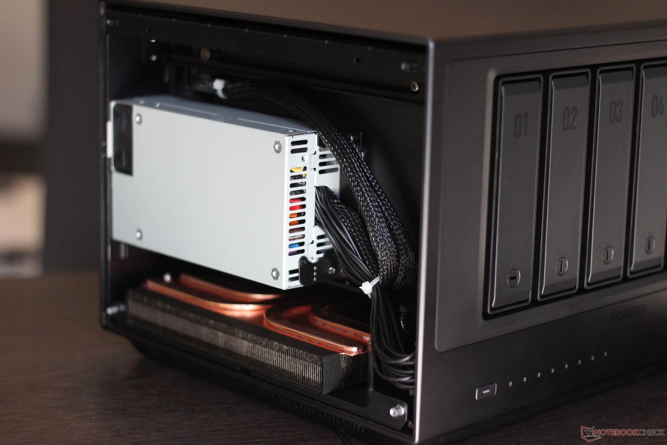 Beide zijpanelen kunnen worden verwijderd. Aan de rechterkant is ruimte voor twee M.2 SSD's, en later kan er ook een PCIe-kaart worden toegevoegd. Dat is niet bijzonder ongebruikelijk voor een NAS. Zo kan er bijvoorbeeld een extra netwerkkaart worden geïnstalleerd.