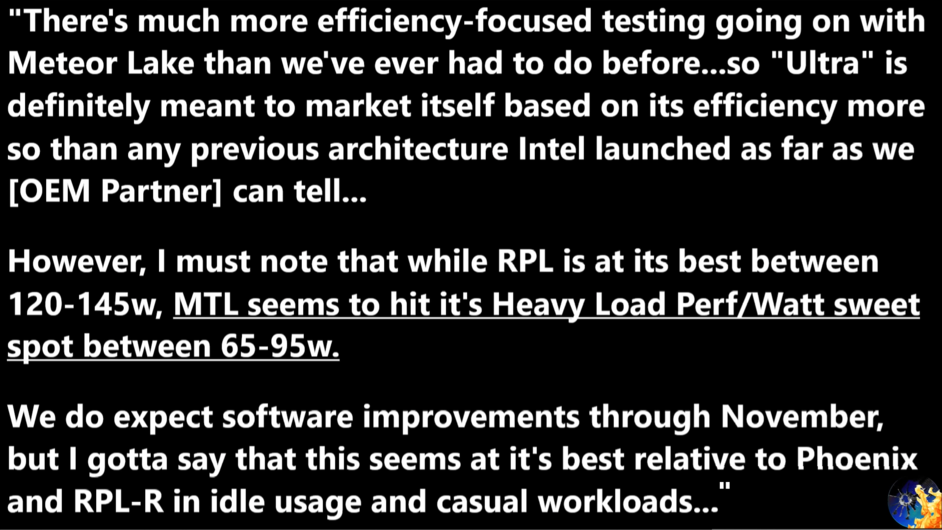 Volgens een van de OEM-bronnen van MLID zouden de Intel MTL "Ultra" CPU's efficiëntie als belangrijkste marketingpunt kunnen hebben, omdat de OEM "veel meer op efficiëntie gerichte tests" heeft moeten doen. De bron beweerde ook dat de MTL-chips hun "Heavy Load Perf/Watt" bereikten tussen 65-95 W, terwijl de Raptor Lake mobiele CPU's optimaal presteerden rond 120-145 W. Met andere woorden, de MTL-processors verbruiken naar verluidt veel minder energie, wat resulteert in een hogere perf/watt.