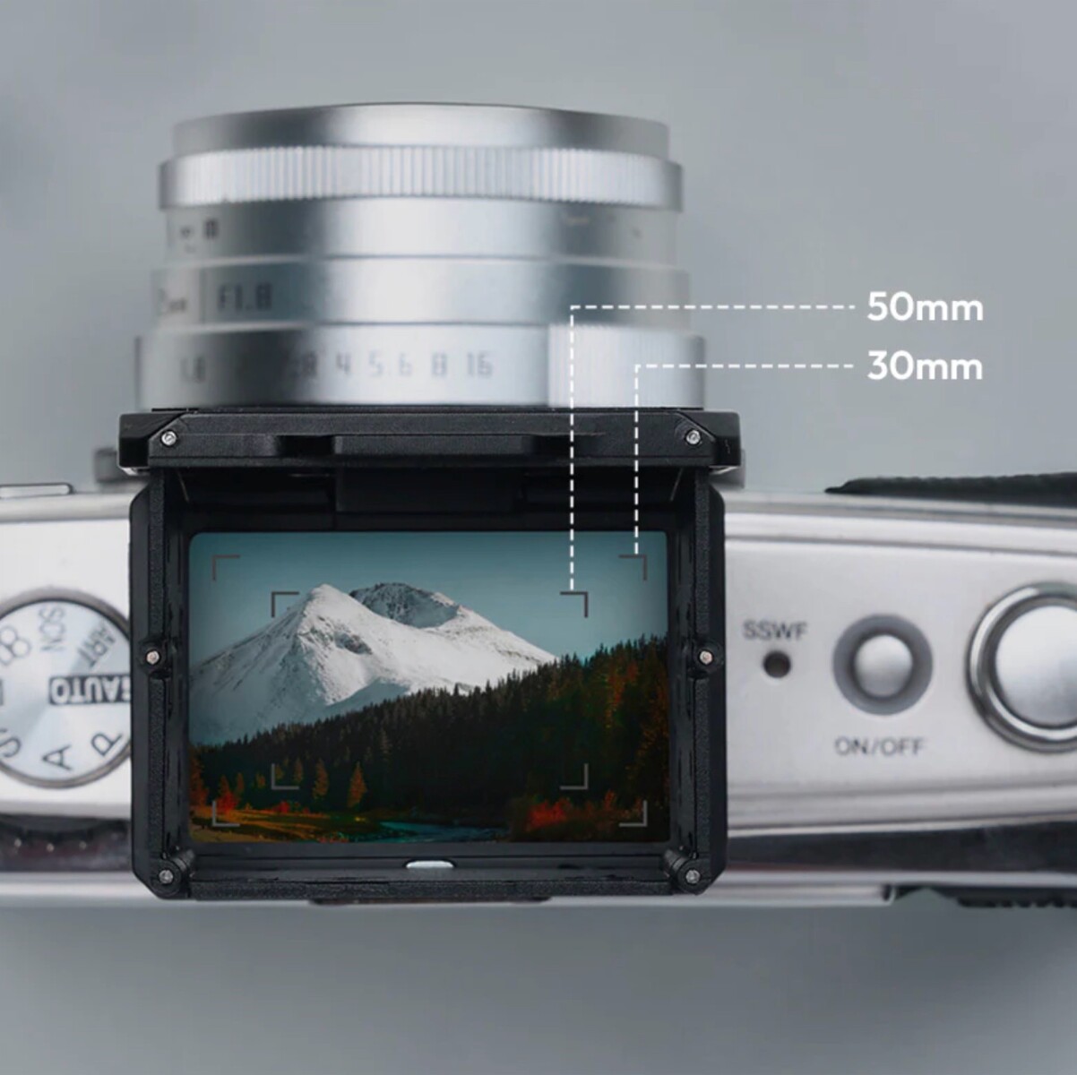 De Ulanzi VF-01 is een optische zoeker die op de flitsschoen van een camera kan worden bevestigd, zodat u op de camera kunt neerkijken om uw opname samen te stellen. Een spiegel en drie lenzen geven het gezichtsveld van een 28mm objectief weer, maar met kaderlijnen kunt u ook het gezichtsveld van een 35mm of 50mm objectief zien.