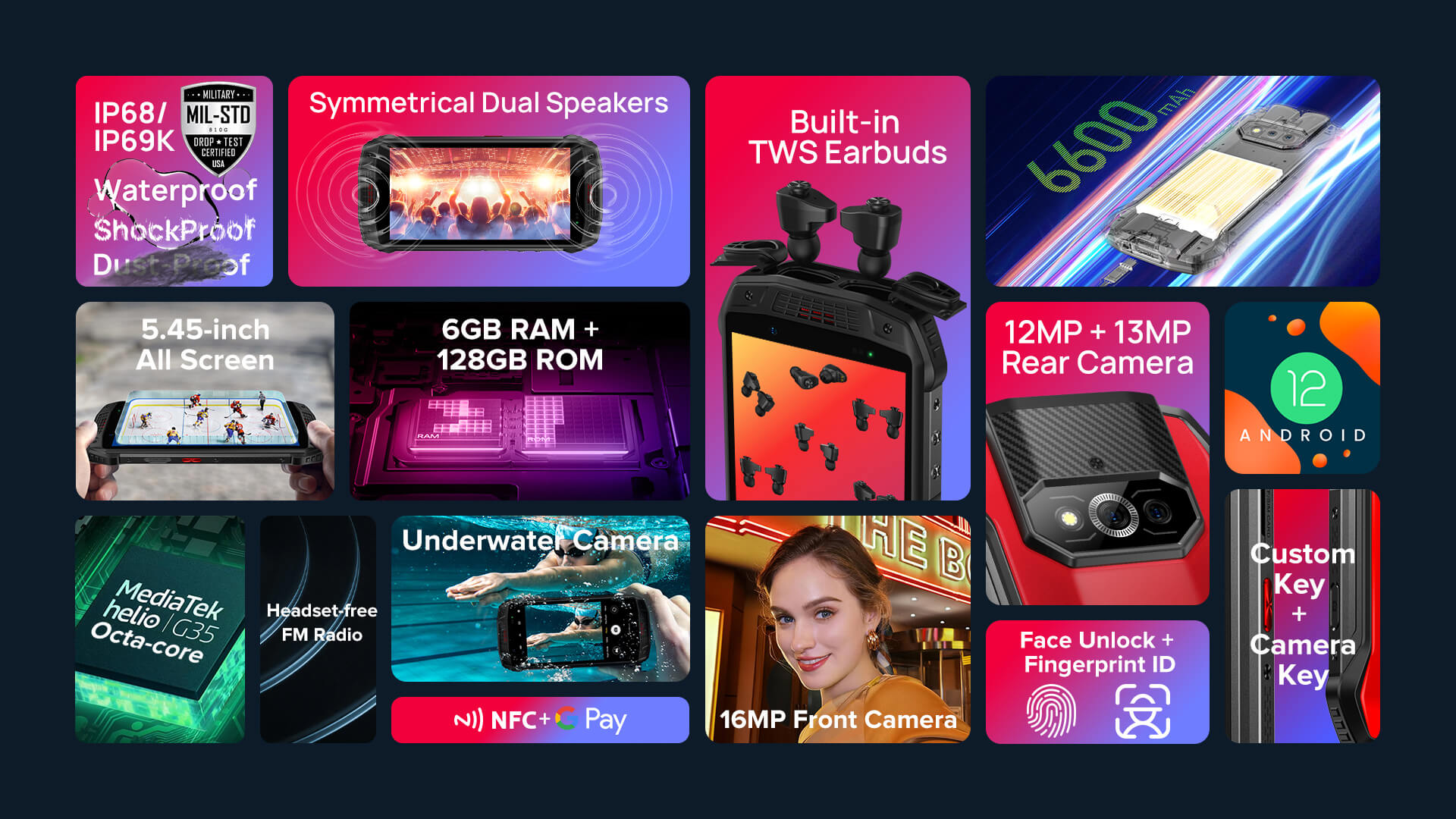 De aankomende 15 is ook een van Ulefone's robuuste modellen, wat betekent dat zelfs zijn 12 + 13MP achterste camera's zijn beoordeeld om te werken onder water dankzij IP68/IP69K en MIL-STD-810 classificaties. Dienovereenkomstig bevat tts bouw serieuze, met rubber beklede dubbele stoppers langs de bovenrand, die wanneer ze worden opengeklapt het eigen paar van de telefoon onthullen TWS oordopjes.