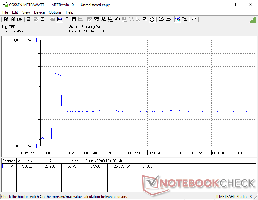 We zijn in staat om een maximale trek van 56 W uit de kleine (~6,5 x 6,5 x 3 cm) 60 W AC-adapter te registreren bij het uitvoeren van extreme belastingen. Dit percentage is echter slechts tijdelijk, zoals blijkt uit de onderstaande screenshots, vanwege het beperkte Turbo Boost potentieel van het model. Gebruikers kunnen een verbruik verwachten van rond de 29 W bij het uitvoeren van de meeste stressvolle scenario's.