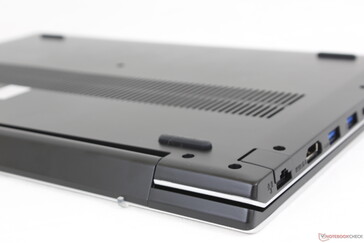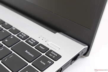Er is een gezonde selectie van geïntegreerde poorten, waaronder 3x USB-A en zelfs een gigabit RJ-45 poort. Het is echter verbijsterend dat de fabrikant nog steeds een eigen AC-adapterpoort integreert, terwijl de meeste andere Ultrabooks van dit formaat al volledig zijn overgestapt op opladen via USB-C. We hadden liever twee USB-C poorten gezien in plaats van één USB-C en één AC-adapterpoort.